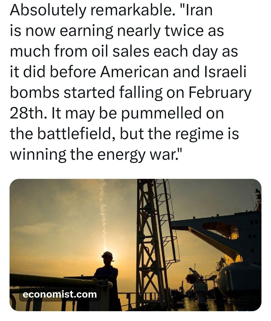 Ըստ «Economist»-ի՝ պատերազմի սկզբի՝ փետրվարի 28-ի, համեմատությամբ, Իրանը մարտի վերջին երկու անգամ ավելի շատ եկամուտ է ստացել իր նավթի վաճառքից, քանի որ միայն իրանական նավթն է, առանց լրացուցիչ ընթացակարգերի և խոչընդոտների, անցնում Հորմուզի նեղուցով։