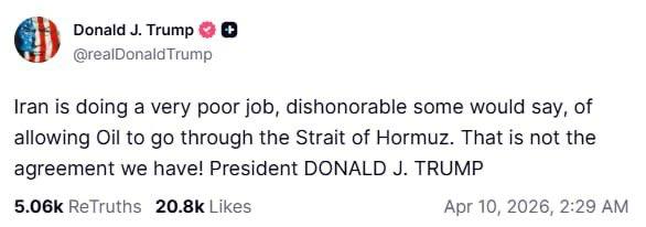 «Իրանը չափազանց վատ աշխատանք է կատարում, անազնիվ` Հորմուզի նեղուցով նավթի անարգել անցումն ապահովելու հարցում։ Սա անհամատեղելի է մեր ձեռք բերված համաձայնագրի հետ», — գրել է Թրամփը ՝ Truth Social սոցիալական ցանցում։